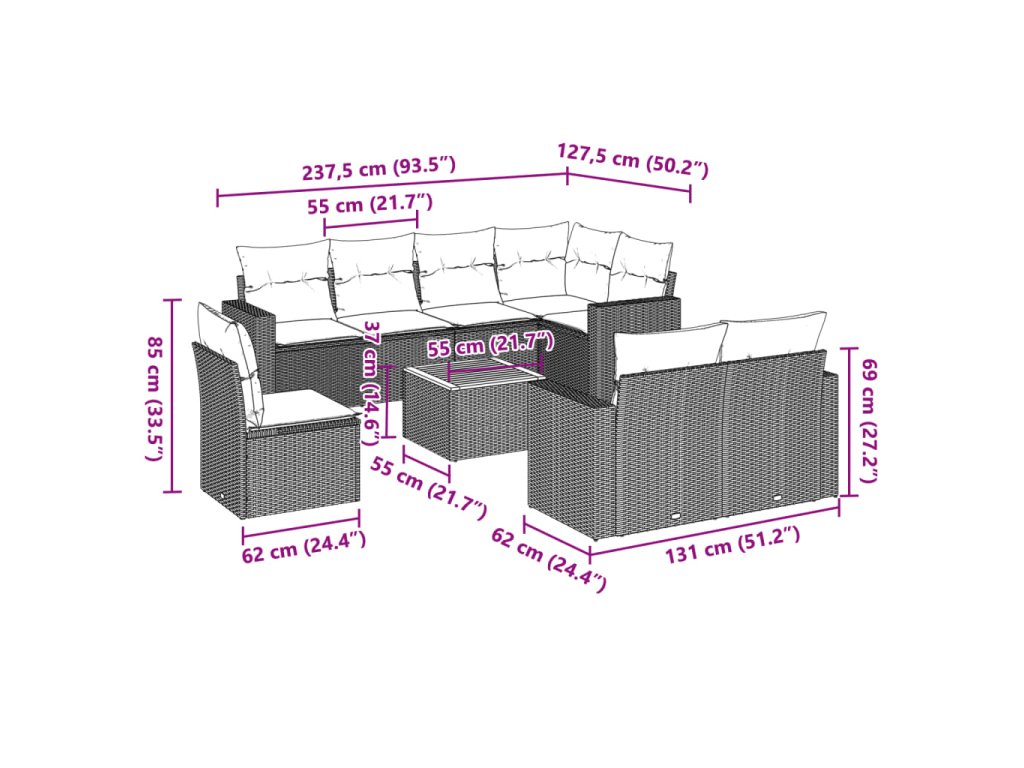 Tato zahradní sedací souprava je dokonalým doplňkem vaší zahrady, terasy nebo dvorku a poskytne vám pohodlné a příjemné místo, kde si můžete povídat s rodinou a přáteli nebo jen tak odpočívat a užívat si pobyt venku.