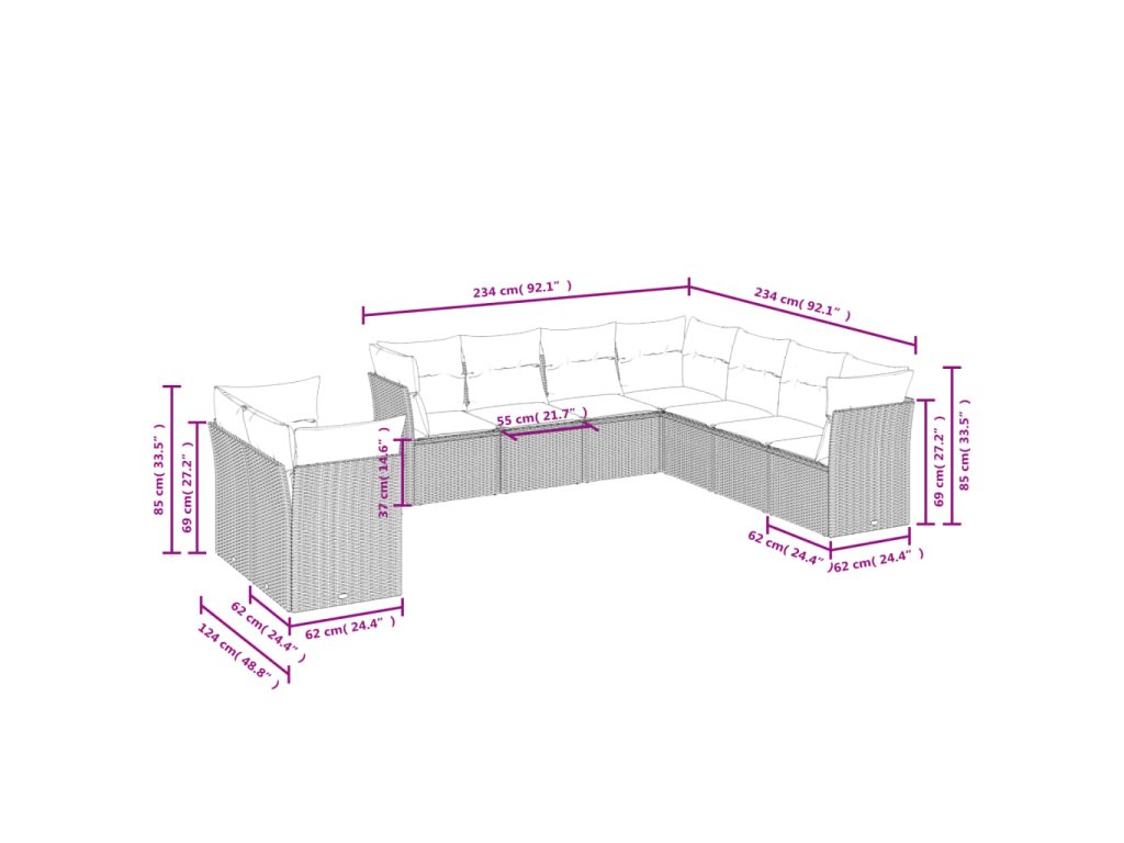 - Celkové rozměry 7místné pohovky: 234 x 234 x 69 cm (Š x H x V)