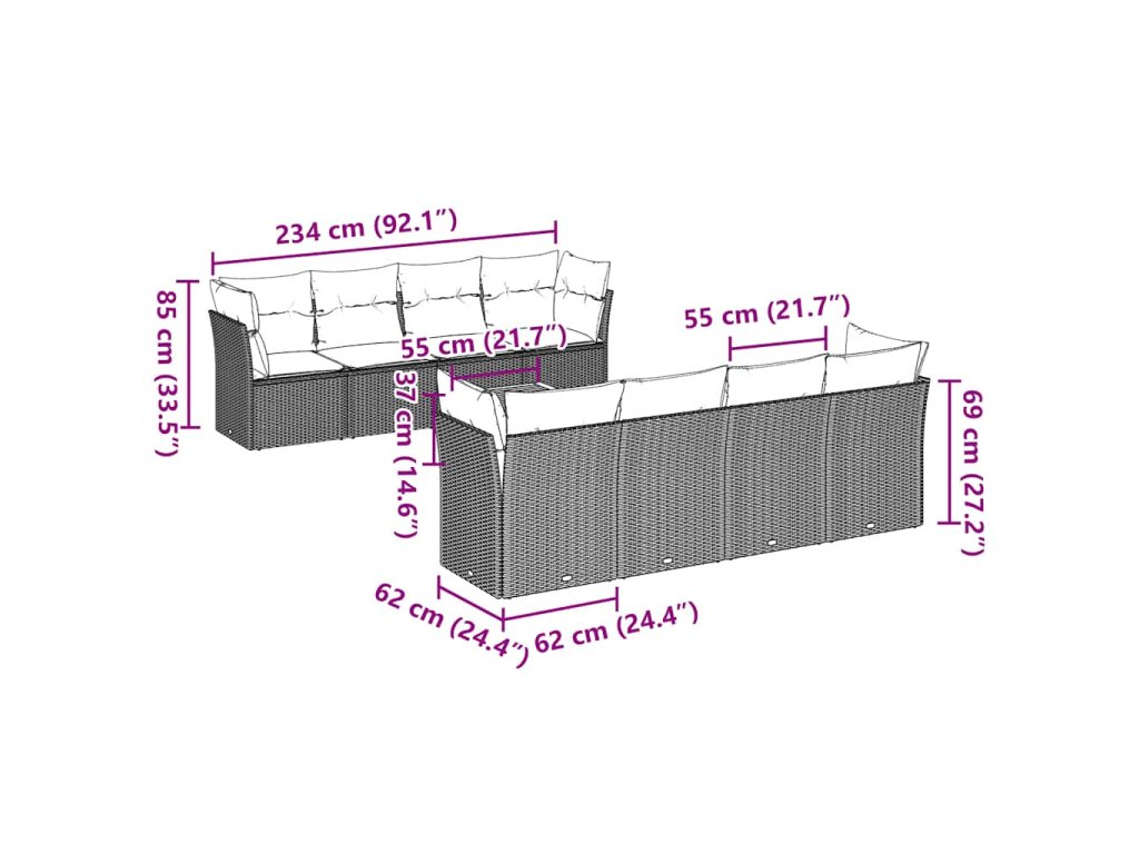Tato zahradní sedací souprava je dokonalým doplňkem vaší zahrady, terasy nebo dvorku a poskytne vám pohodlné a příjemné místo, kde si můžete povídat s rodinou a přáteli nebo jen tak odpočívat a užívat si pobyt venku.