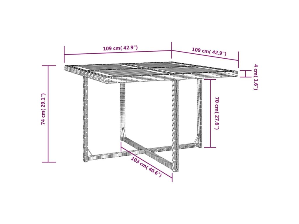 - Rozměry stolu: 109 x 109 x 74 cm (D x Š x V)