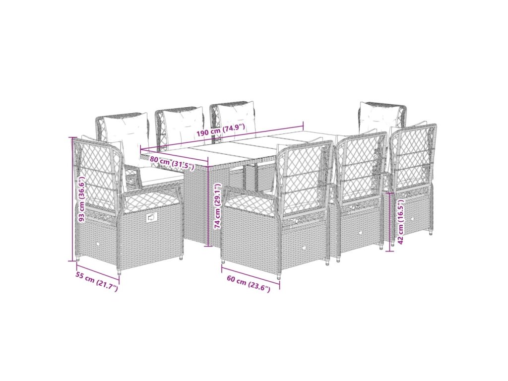 - Pohodlné sezení: Tento venkovní nábytek se silně polstrovanými poduškami a polštáři nabízí pohodlné sezení.
