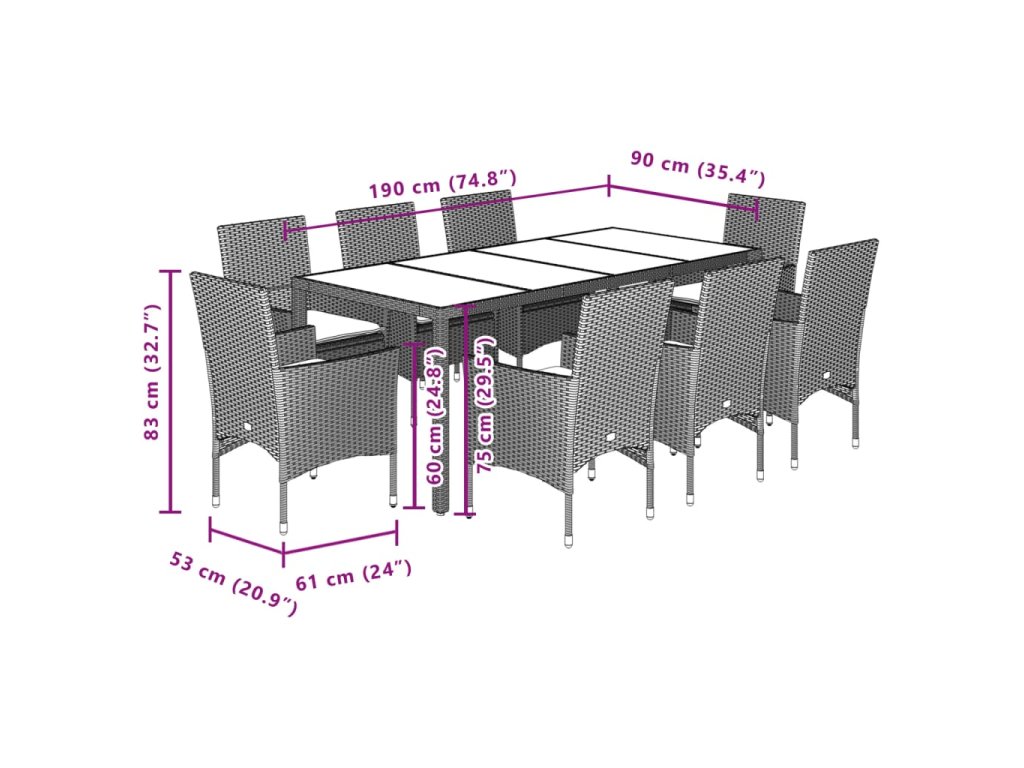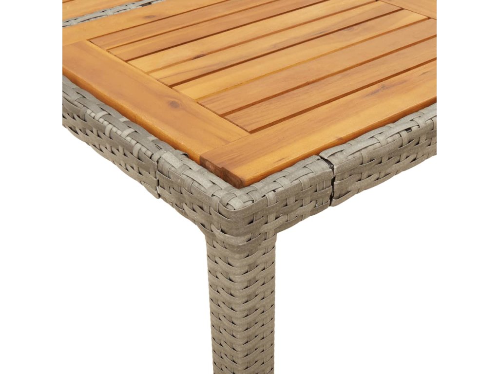- Materiál: PE ratan, práškově lakovaná ocel, masivní akáciové dřevo s olejovou povrchovou úpravou