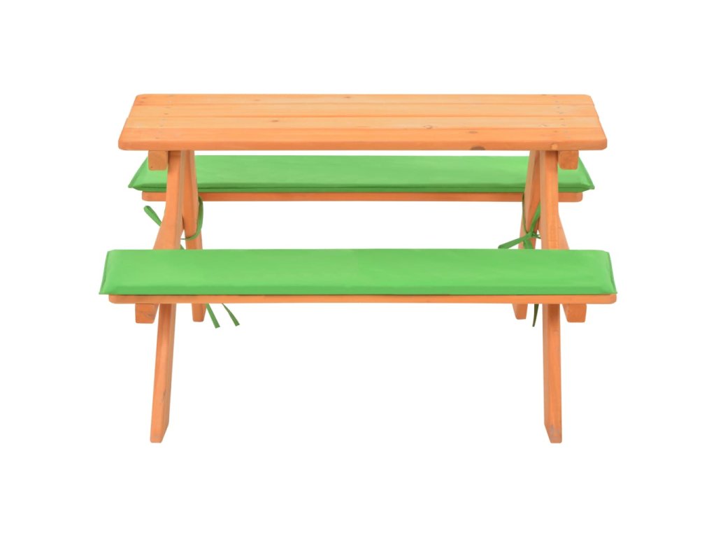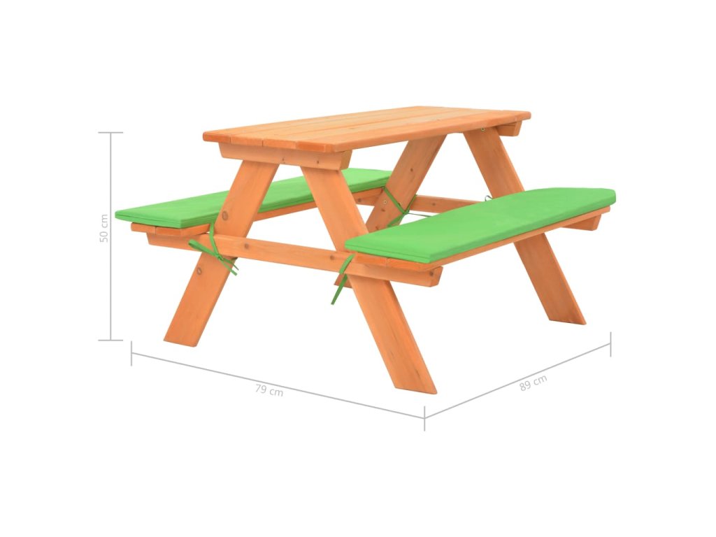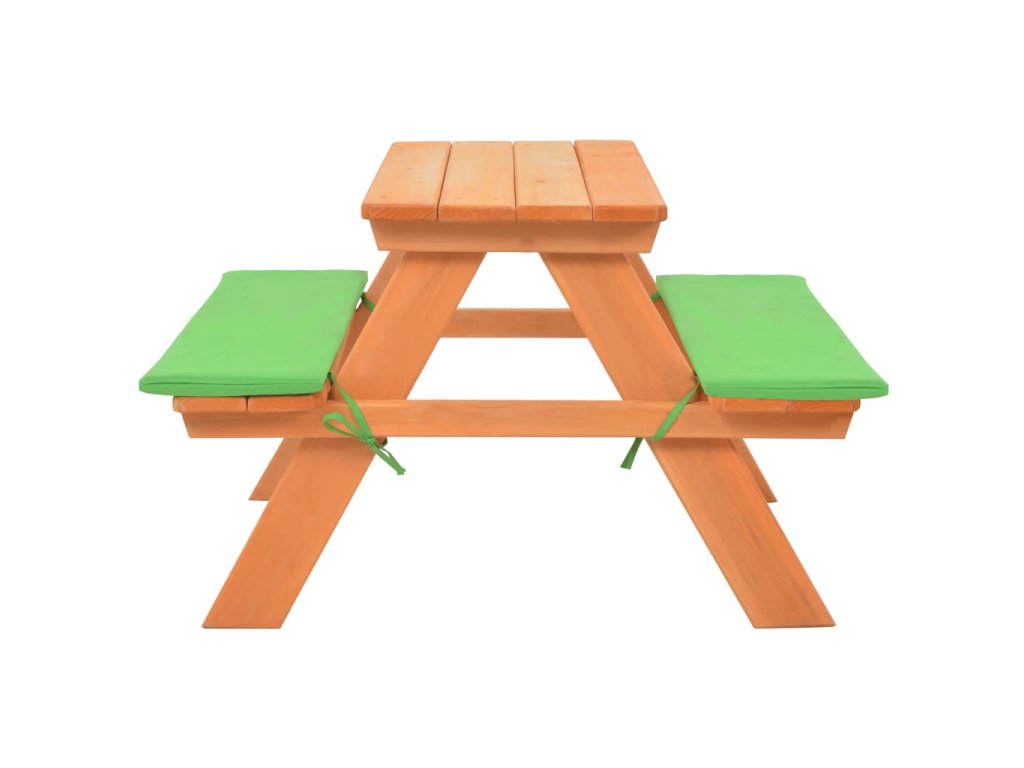 Piknikový stůl je vyroben z masivního jedlového dřeva, které je odolné vůči povětrnostním vlivům a dává vzniknout stabilní a pevné konstrukci. Součástí balení jsou též podušky zhotovené z voděodolného polyesterového materiálu. Tyto podsedáky jsou silně polstrované pro maximální komfort. Dětský piknikový stůl se snadno sestavuje.