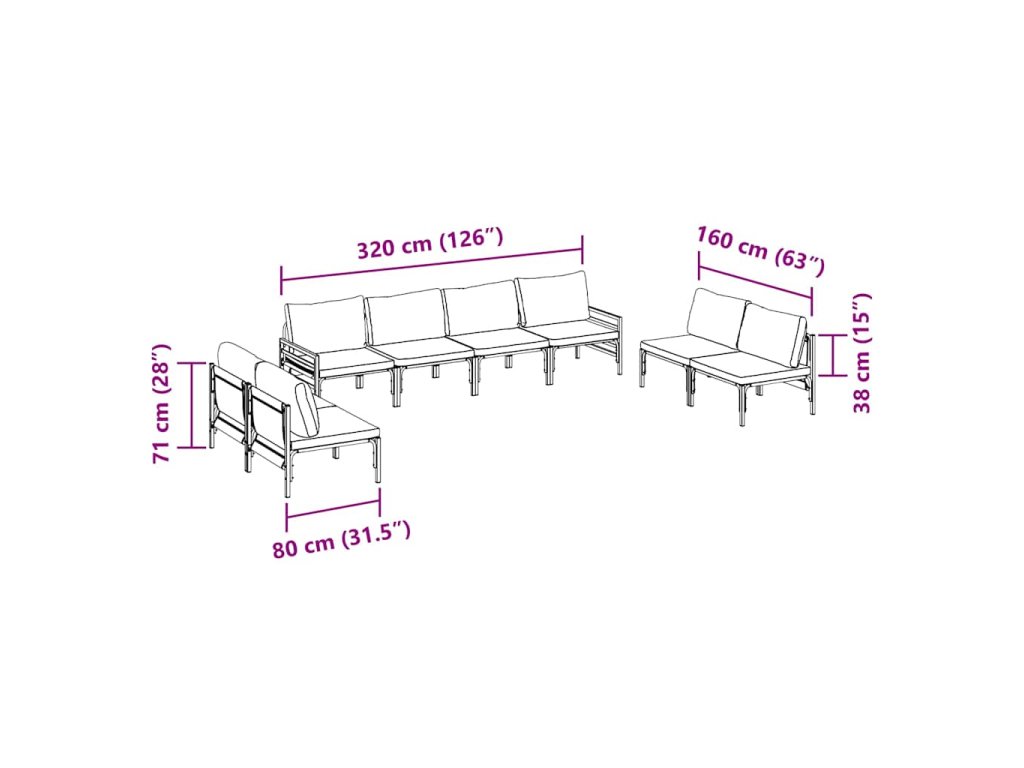 Tato sada venkovního nábytku s polstrováním je univerzální volbou pro jakýkoli venkovní obytný prostor, nabízející jak styl, tak funkčnost. Její modulární design umožňuje adaptabilní uspořádání, které vyhovuje různým sezením pro shromáždění nebo poklidný čas. Elegantní linie a moderní vzhled ji činí sofistikovaným doplňkem zahrad, teras a prostorů na dvorku.