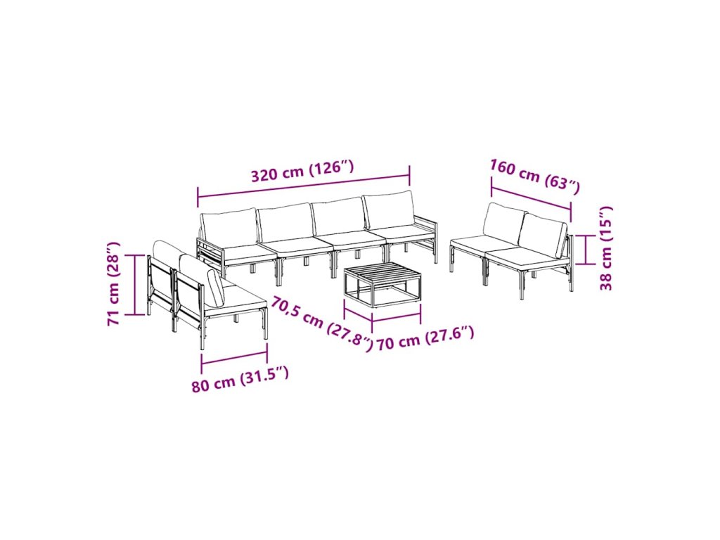 Tato sada venkovního nábytku s polstrováním je univerzální volbou pro jakýkoli venkovní obytný prostor, nabízející jak styl, tak funkčnost. Její modulární design umožňuje adaptabilní uspořádání, které vyhovuje různým sezením pro shromáždění nebo poklidný čas. Elegantní linie a moderní vzhled ji činí sofistikovaným doplňkem zahrad, teras a prostorů na dvorku.