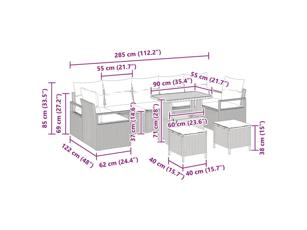 - Funkční úložné prostory: Tato zahradní sada zahrnuje pohovky s armovými a centrálními sedadly a chytrými úložnými místy, co poskytnou dostatek prostoru na uschování polštářů a dek. Chytrý design znamená, že je to praktické, ale přitom stylové.