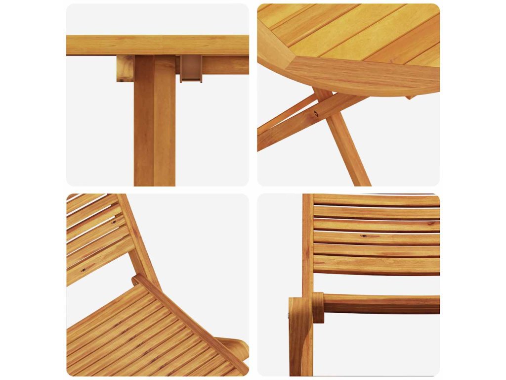 - Peckovní akáciové dřevo: Tento rustikální skládací bistro set je vyrobený z kvalitního akáciového dřeva s organickým šarmem, takže vydrží dlouho. Je odolný vůči opotřebení a povětrnostním podmínkám. Olejování mu dodává skvělý vzhled a chrání ho proti vlhkosti.