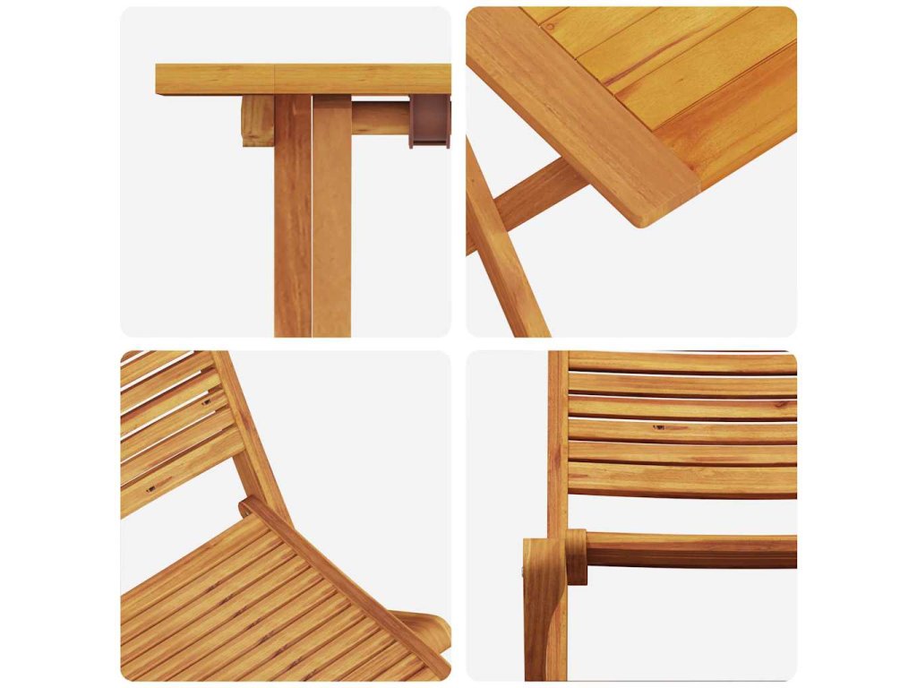 - Peckovní akáciové dřevo: Tento rustikální skládací bistro set je vyrobený z kvalitního akáciového dřeva s organickým šarmem, takže vydrží dlouho. Je odolný vůči opotřebení a povětrnostním podmínkám. Olejování mu dodává skvělý vzhled a chrání ho proti vlhkosti.