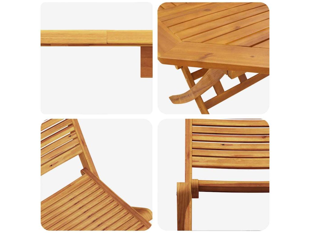 - Peckovní akáciové dřevo: Tento rustikální skládací bistro set je vyrobený z kvalitního akáciového dřeva s organickým šarmem, takže vydrží dlouho. Je odolný vůči opotřebení a povětrnostním podmínkám. Olejování mu dodává skvělý vzhled a chrání ho proti vlhkosti.