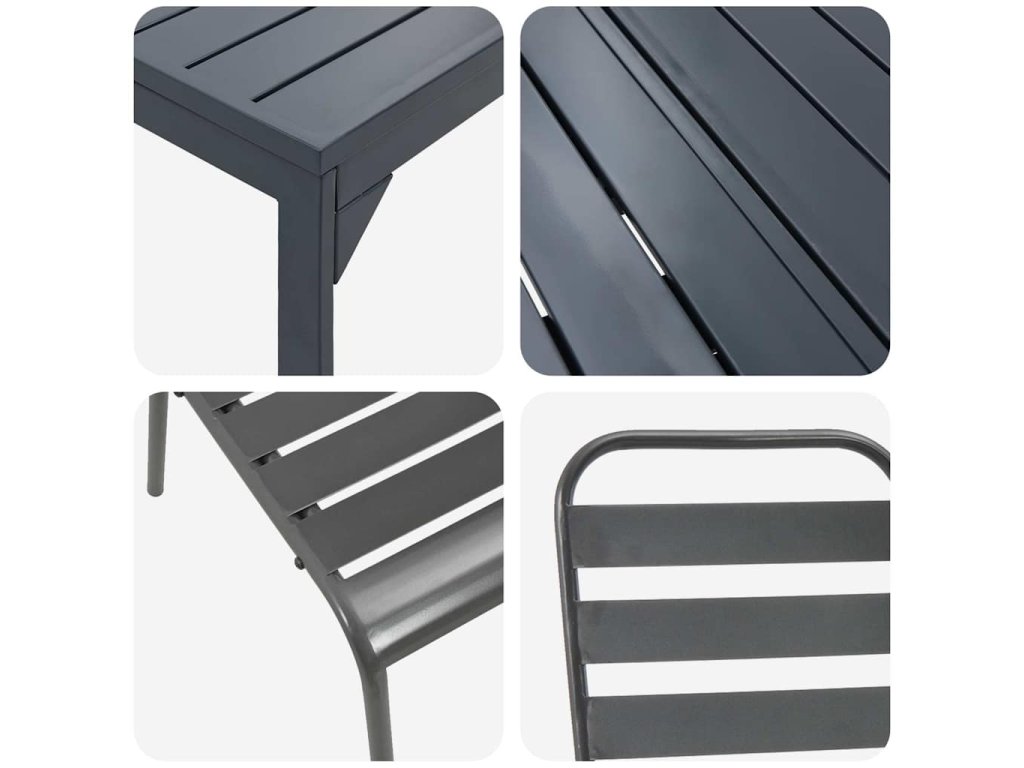 Moderní zahradní jídelní set představuje soudobou eleganci, navržený tak, aby vylepšil venkovní prostory svými hladkými liniemi a minimalistickým stylem. Vytvořen pro setkávání, přispívá k nezapomenutelným zážitkům při venkovním stolování během letních měsíců a nabízí stylový, ale robustní prvek pro terasy nebo zahrady. Jeho hladké, antracitově dokončené povrchy vyzařují moderní estetiku a zároveň zajišťují trvalý výkon.