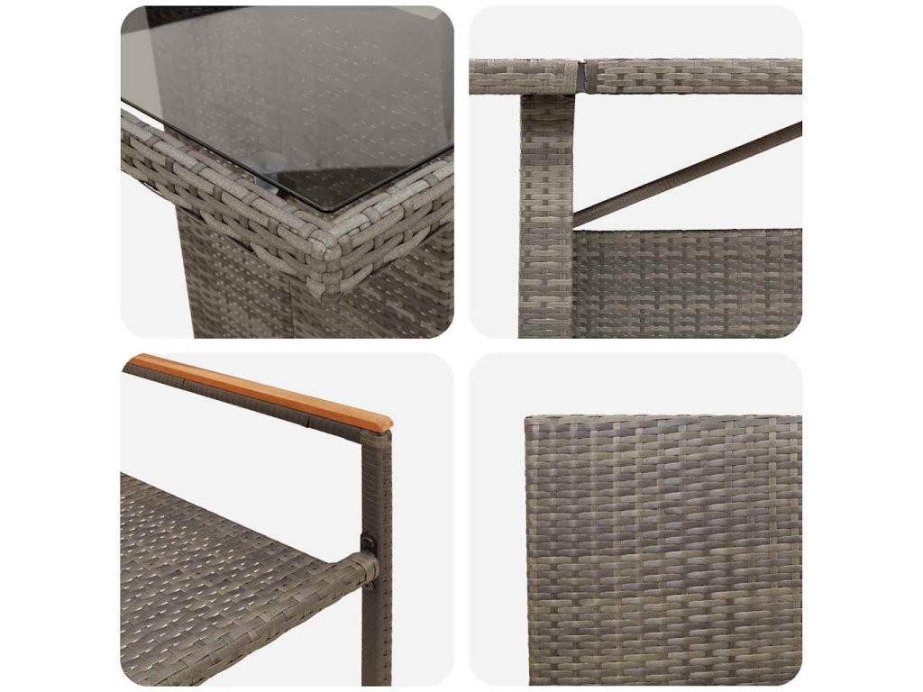 Tato moderní venkovní sada nábytku je parádní mix stylu a funkce, což z ní dělá super volbu pro zahrady a terasy, kde si chceš užívat venkovního stolování nebo jen tak relaxovat. Elegantní obdélníkový tvar dodává moderní atmosféru, je jednoduchý a praktický, žádné zbytečnosti. Nabízí dostatek místa na sezení, ideální pro letní večírky nebo pohodové rodinné chillování. Představ si, jak si užíváš čas na terase, povídáš si s kamarády, obklopený odolným polyratanem a hladkými liniemi, suitable for co vyzařují pohodlí a styl.