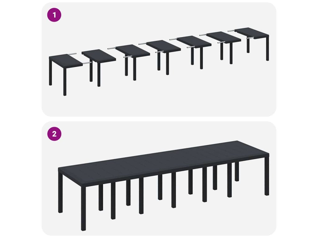 - Sofistikovaný design: Tato zahradní jídelní souprava zosobňuje štíhlý a minimalistický styl, což z ní činí ideální doplněk pro moderní venkovní prostory. Její moderní estetičnost je definována čistými liniemi a obdélníkovým tvarem, který bezproblémově zapadá do různých dekorativních stylů, čímž zvyšuje jak funkci, tak formu ve vaší zahradě.