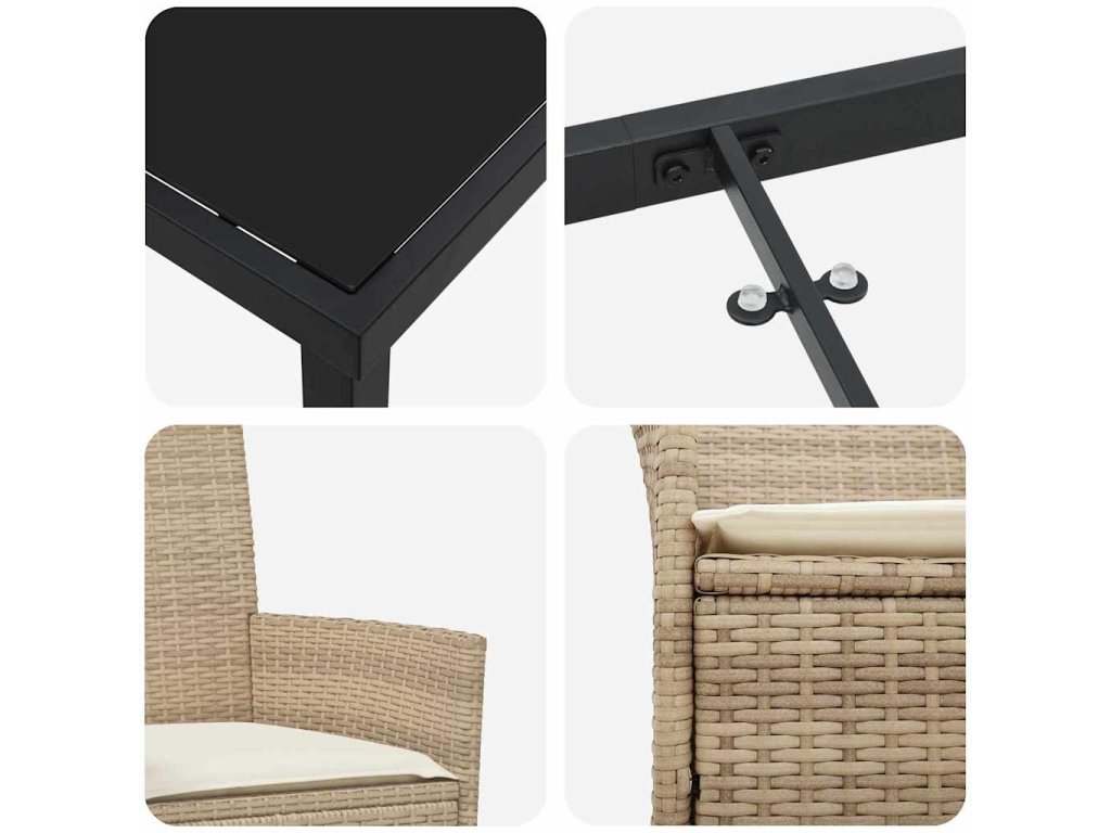 Tahle moderní zahradní jídelní souprava spojuje styl a funkčnost a udělá z jakýhokoli venkovního prostoru elegantní jídelní zónu. Je pečlivě navržená pro jednoduchost a eleganci, má pevný, ale stylový stůl se skleněnou deskou a pohodlný židle z poly ratanu, který zvládnou venkovní počasí a vydrží. Představ si večer s přáteli a rodinou ve tvé zahradní oáze, všichni se sejdou kolem tohohle pěkně navrženýho jídelního setu.