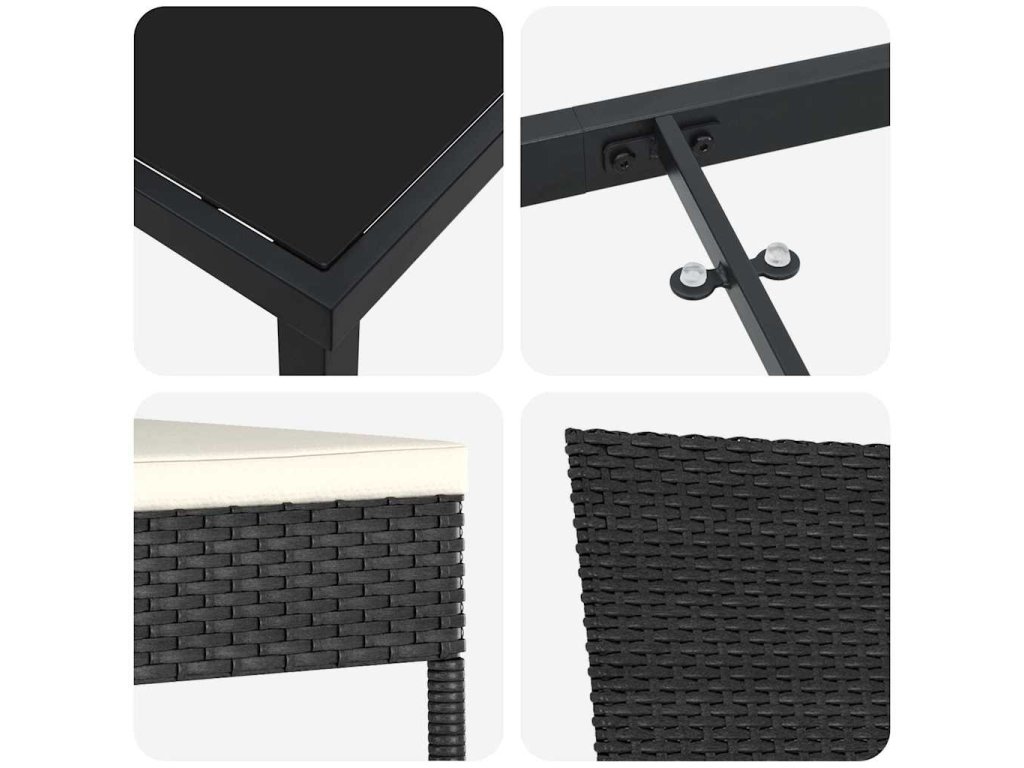- Součásti: Souprava zahrnuje skleněnou desku stolu, která dodává elegance a snadno se udržuje. Tkaná opěra z polyratanu nabízí styl a pohodlí, zatímco polyesterové polštáře mají zipy pro jednoduchou údržbu. Černý práškově lakovaný ocelový rám to všechno spojuje a zajišťuje spolehlivost po mnoho let.