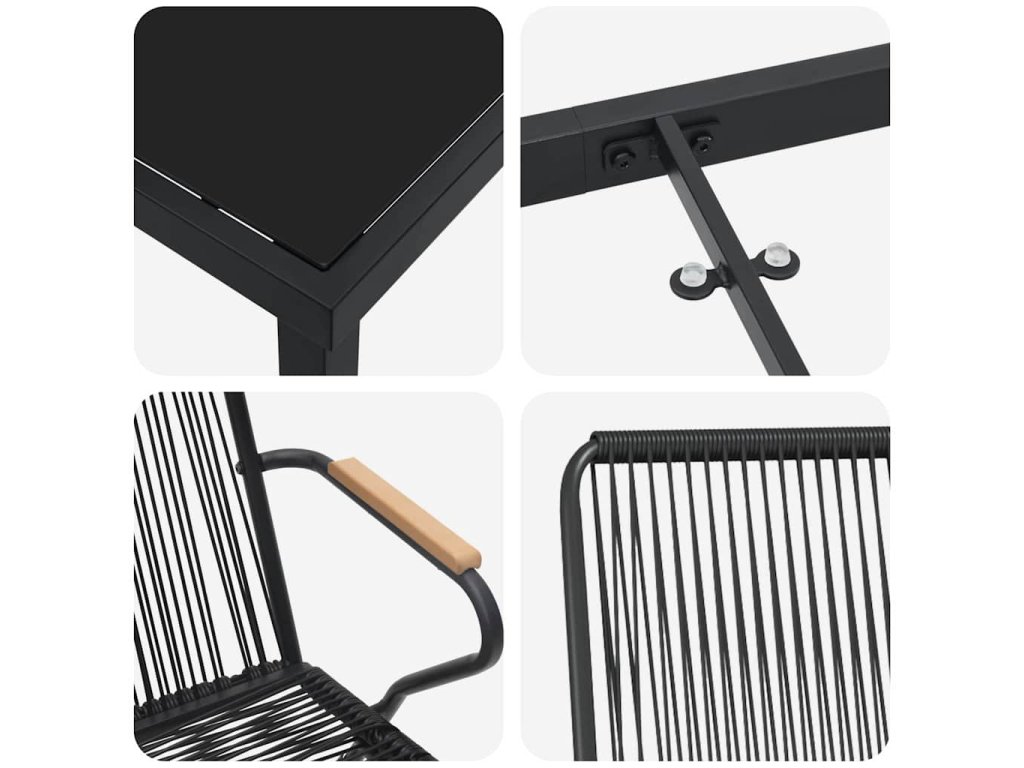 - Součásti: Tato nábytková souprava obsahuje ergonomické opěrky vyrobené z PVC, smíchané s práškově lakovanými ocelovými opěrkami a nohama pro pohodlné sezení. K tomu je tady hladký stůl z tvrzeného skla, který se snadno čistí – perfektní pro jídlo nebo nápoje, což spojuje praktičnost s elegantním vzhledem.