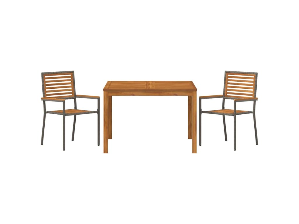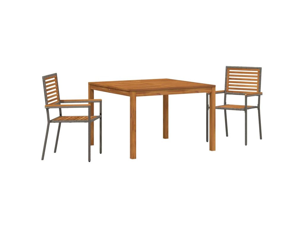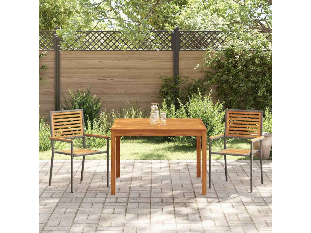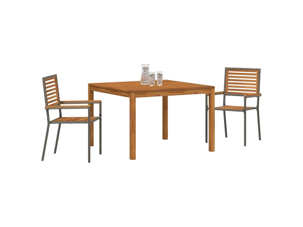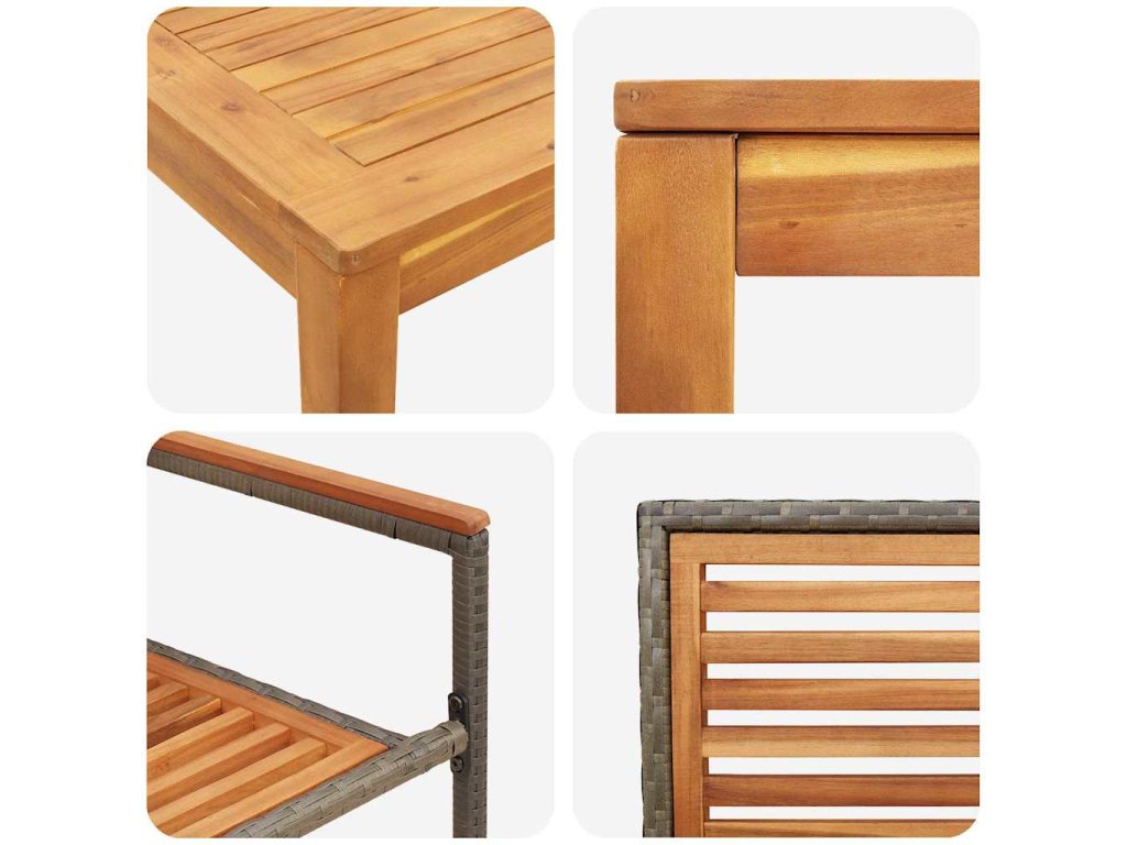 - Funkční komponenty Set zahrnuje obdélníkový stůl, židle s sedáky a opěradly z masivního akáciového dřeva a poly ratanové opěrky na ruce, každá z nich zpracována s pečlivostí. Tyto kvalitní komponenty poskytují pohodlí a odolnost, což dělá stolování nebo odpočinek venku potěšením.