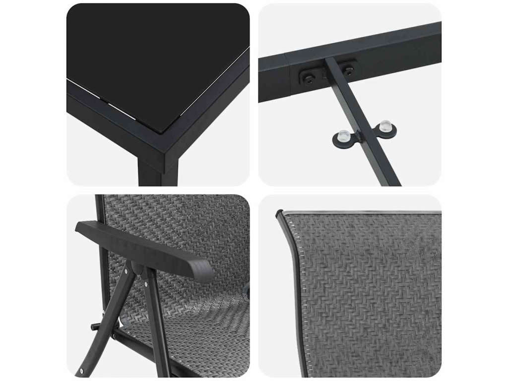 - Součásti: Set zahrnuje poly ratanová sedadla s oporou zad a pohodlnými loketními opěrkami. Stůl s temperovaným sklem poskytuje hladký a stabilní povrch, ideální pro stolování nebo jiné aktivity. Všechny části, od práškově lakovaných ocelových nohou po tkané poly ratanové opěrky, spolu dokonale spolupracují, aby zajistily pohodlí a stabilitu.