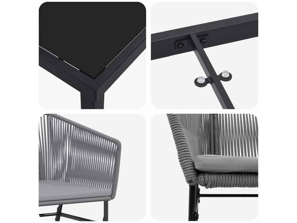 - Součásti balení: K maximálnímu pohodlí přispívá skleněná stolová deska, která zve k malým rozhovorům a smíchu během skvělých jídel. Jemně tkaná poly ratanová opěradla a područky nabízejí komfort, zatímco dobře navržené práškově lakované ocelové nohy a rám zajišťují stabilitu. Tyto prvky spolu perfektně fungují, aby zajistily dlouhodobou spokojenost a pohodlné používání.