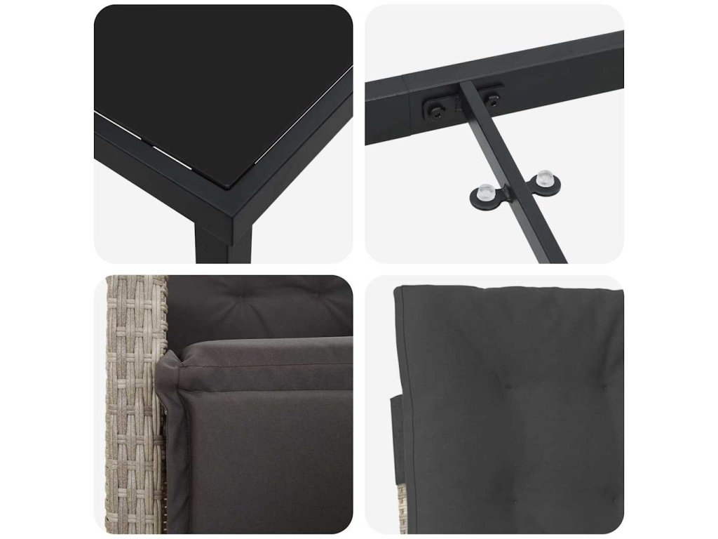 - Komponenty: Každý kousek je udělaný s péčí a obsahuje pohodlná sedadla a opěradla z poly ratanu. Pevné ocelové nohy zajišťují stabilní základ, zatímco hladké skleněné desky jsou stylovým doplňkem.