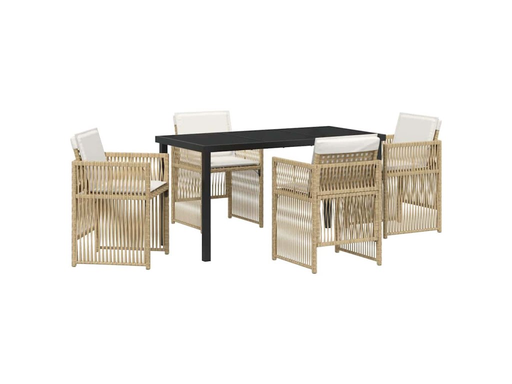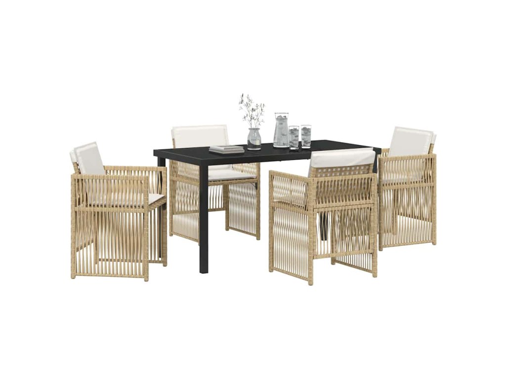 - Součásti: Najdeš obdélníkový stůl s tvrzeným sklem, který se snadno čistí, a pohodlné židle z polyratanu. Každá židle má pěnové polstrované polštáře se zipy, takže je to pohodlné a lehce se o ně stará.