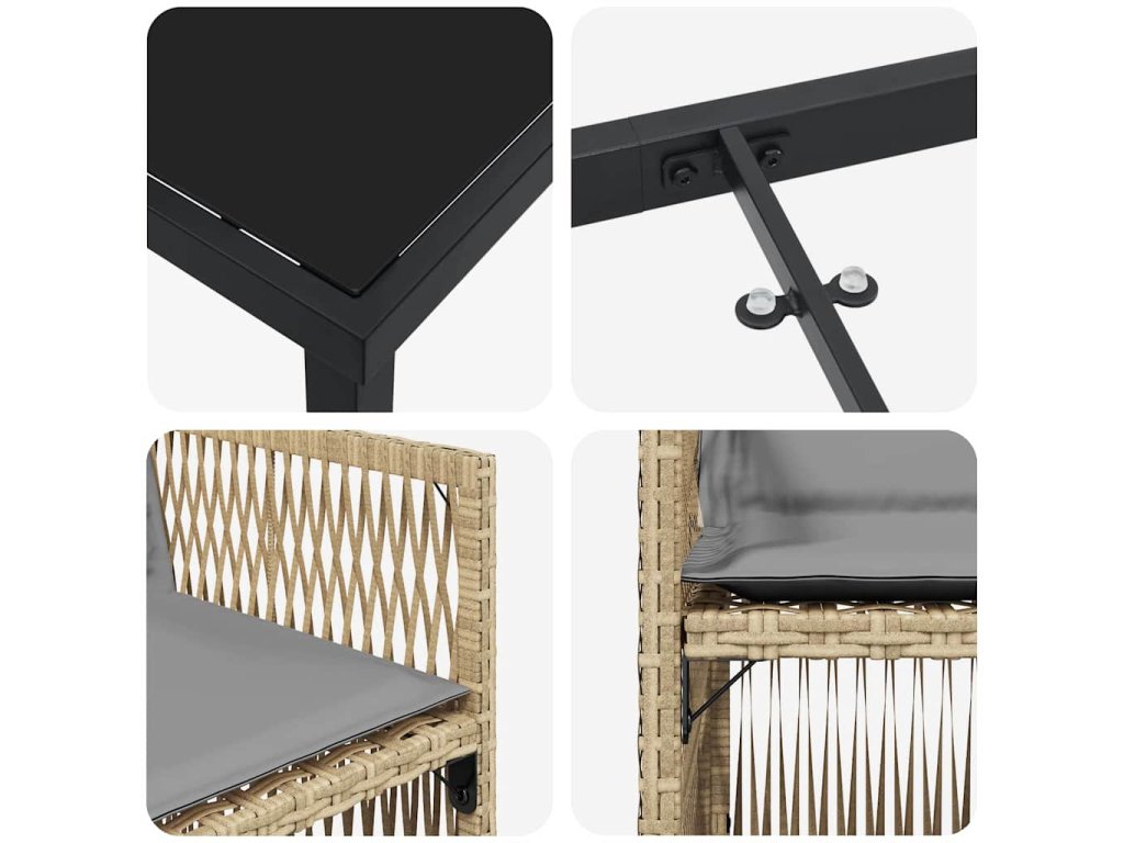 - Součásti: Najdeš obdélníkový stůl s tvrzeným sklem, který se snadno čistí, a pohodlné židle z polyratanu. Každá židle má pěnové polstrované polštáře se zipy, takže je to pohodlné a lehce se o ně stará.