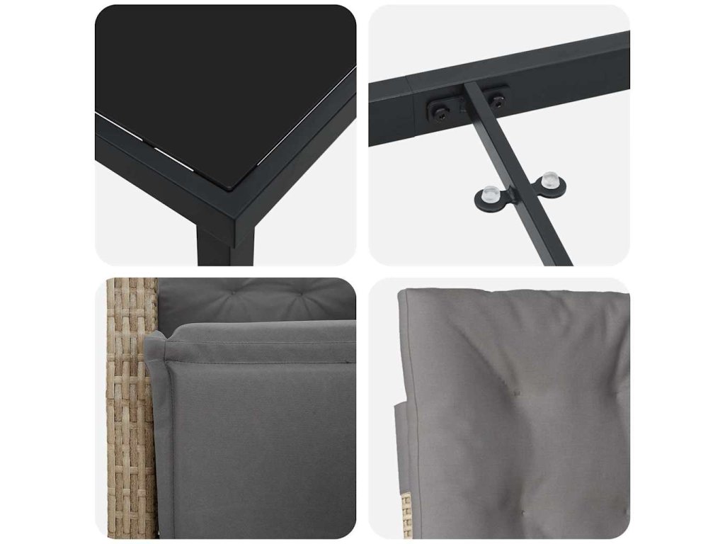 - Komponenty: Každý kousek je udělaný s péčí a obsahuje pohodlná sedadla a opěradla z poly ratanu. Pevné ocelové nohy zajišťují stabilní základ, zatímco hladké skleněné desky jsou stylovým doplňkem.