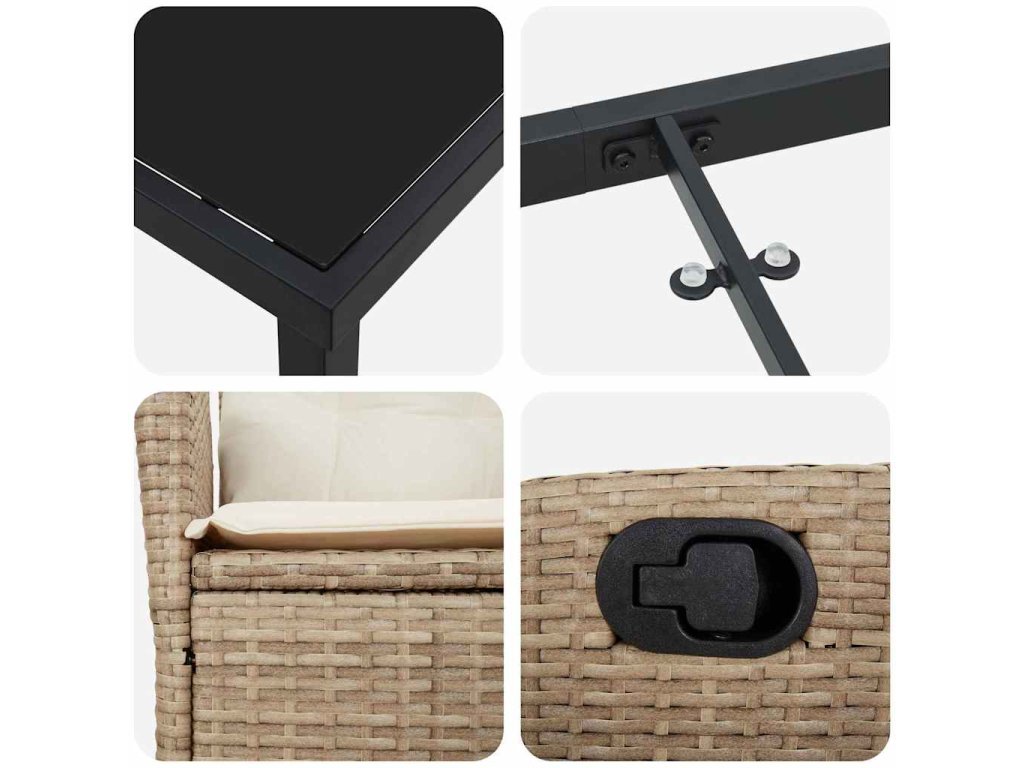 - Materiály: Set je vyroben z kvalitního poly ratanu, oceli a skla. Poly ratan dodává příjemnou texturu a elegantní touch, a skvěle odolává letnímu počasí. Ocelová konstrukce zajišťuje silnou oporu a stabilitu, zatímco skleněná deska je elegantní a lehce se čistí.