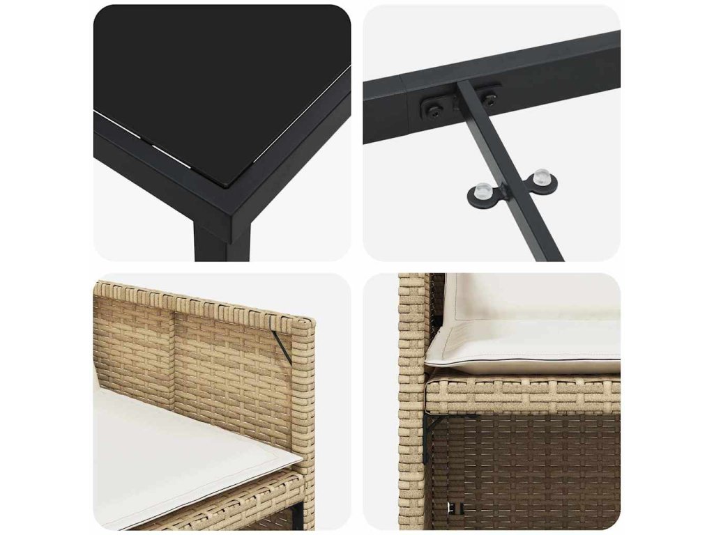 - Moderní materiály: Tento set je udělaný z chytré směsi poly ratanu a skla, což mu dodává originální styl. Poly ratan je známý svou odolností vůči počasí a barvy si dlouho udržuje. Skleněné povrchy přidávají elegantní a moderní vzhled, který skvěle vypadá venku a snadno se čistí.