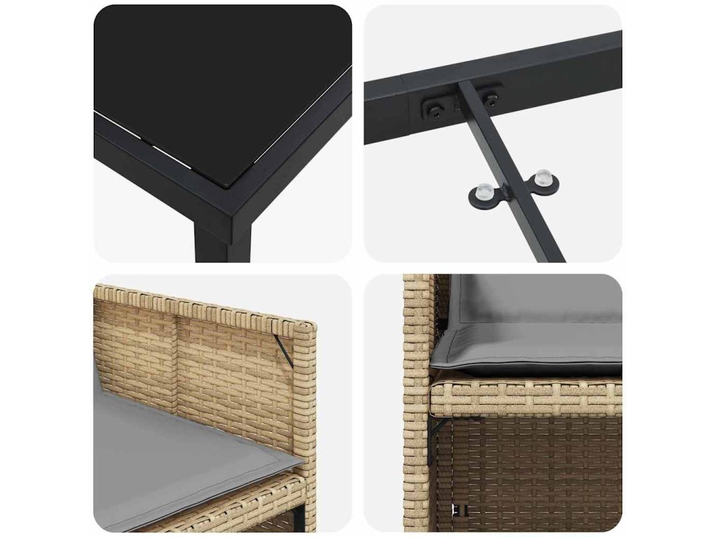 - Moderní materiály: Tento set je udělaný z chytré směsi poly ratanu a skla, což mu dodává originální styl. Poly ratan je známý svou odolností vůči počasí a barvy si dlouho udržuje. Skleněné povrchy přidávají elegantní a moderní vzhled, který skvěle vypadá venku a snadno se čistí.
