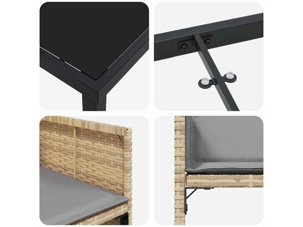 Tento úžasný zahradní lounge set perfektně spojuje moderní design s užitečností, což z něj dělá skvělou volbu pro venkovní relaxaci a akce. Je určen pro ty, kdo chtějí elegantní a moderní vzhled s čistýma línijema a bez zbytečností. Ideální pro zahrady a terasy, stane se krásným středobodem, který vybízí přátele a rodinu k odpočinku v pohodlí a stylu vedle nádherné přírody.
