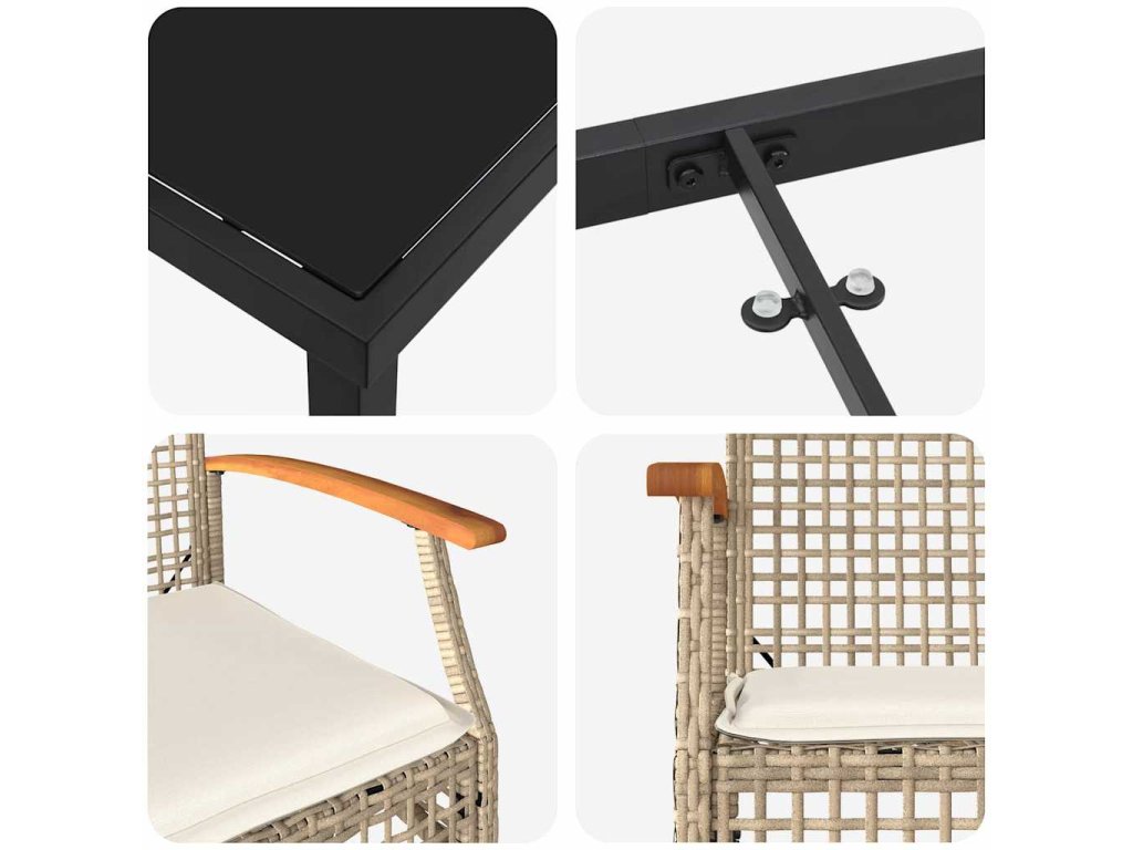 - Odolné materiály: Skvělý mix pevného akáciového dřeva znamená, že váš jídelní set zvládne všechny letní párty. Přirozený vzor dřeva dodává šmrnc elegance a poly ratanové židle jsou pohodlné a trendy. Černá skleněná deska přidává dojem sofistikovanosti ke každému jídlu nebo setkání.
