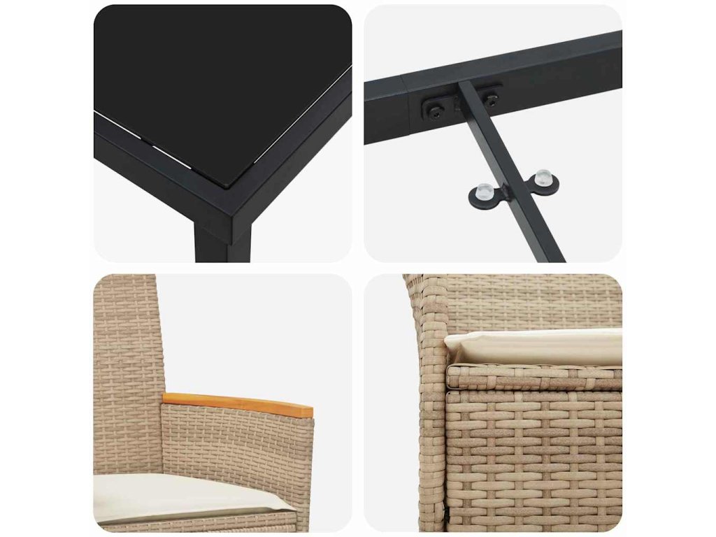 - Součásti: S elegantním skleněným vrškem a štíhlými ocelovými nohami přidá set elegantní vzhled, kamkoli ho dáte. Polyratanové opěrky jsou pohodlné a polštáře z polyesteru zajišťují komfortní sezení.