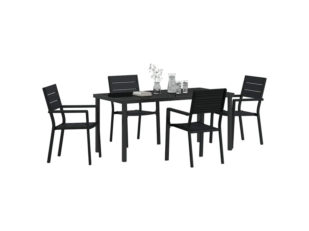 - Moderní Design: Zahradní jídelní set je vyroben s ohledem na moderní estetiku, s čistými liniemi a minimalistickým vzhledem. Jeho černý tón se bezproblémově mísí do současných venkovních prostor, zvyšuje atmosféru jakéhokoli prostředí, v němž se nachází. Tento set neslouží pouze funkci, ale také stylu.