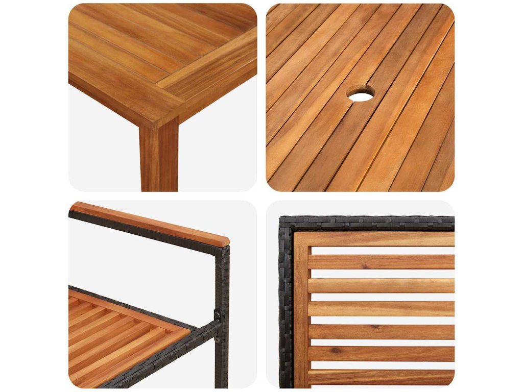 - Materiály: Vyrobeno z poly ratanu odolného vůči UV záření a počasí. Dřevěné akcenty dodávají hezký dotek a zajišťují jeho odolnost v silném počasí bez velké údržby. n