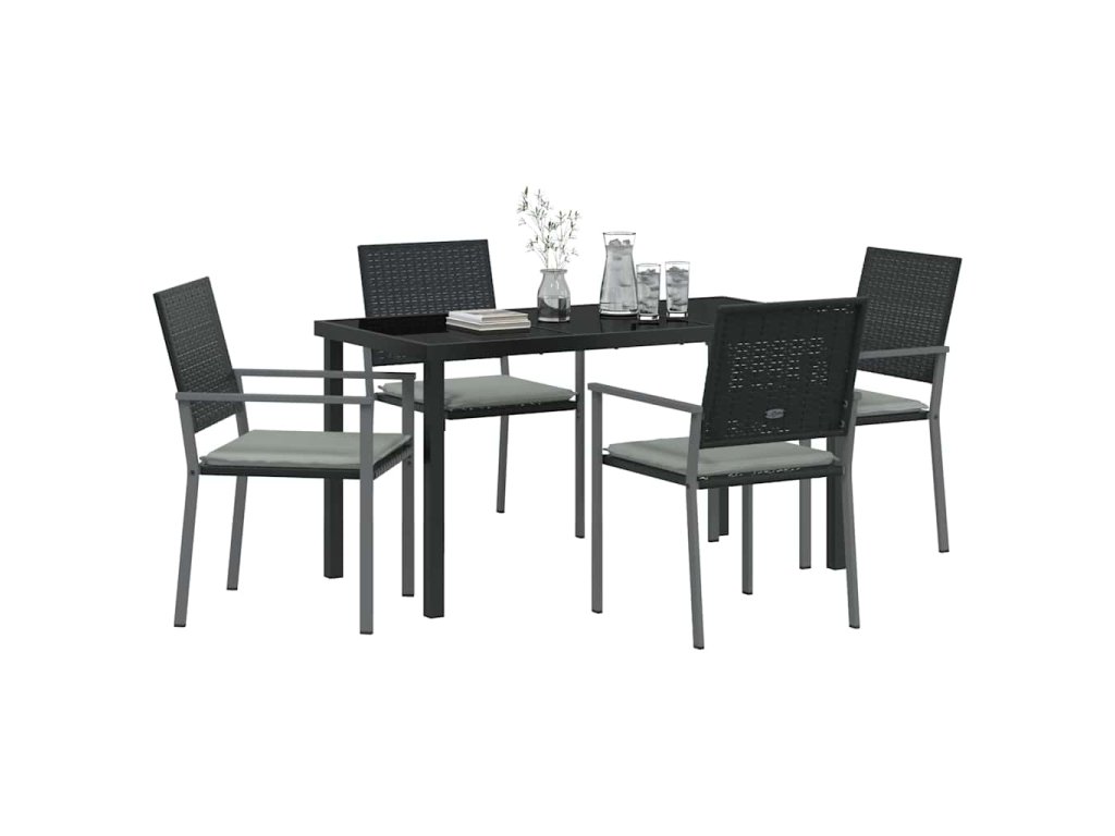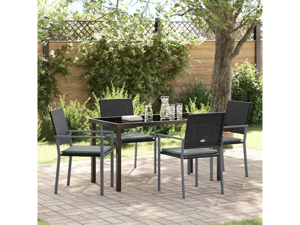 - Tvrzené skleněné povrchy: Stůl má vrchní část z tvrzeného skla, která spojuje eleganci s praktičností. Tento povrch odolává poškrábání a je snadno čistitelný, což je významná výhoda pro venkovní stolování. Černá barva ladí s moderním stylem a zvyšuje celkovou atmosféru zahrady a vizuální přitažlivost sady.
