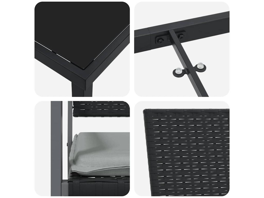 - Tvrzené skleněné povrchy: Stůl má vrchní část z tvrzeného skla, která spojuje eleganci s praktičností. Tento povrch odolává poškrábání a je snadno čistitelný, což je významná výhoda pro venkovní stolování. Černá barva ladí s moderním stylem a zvyšuje celkovou atmosféru zahrady a vizuální přitažlivost sady.