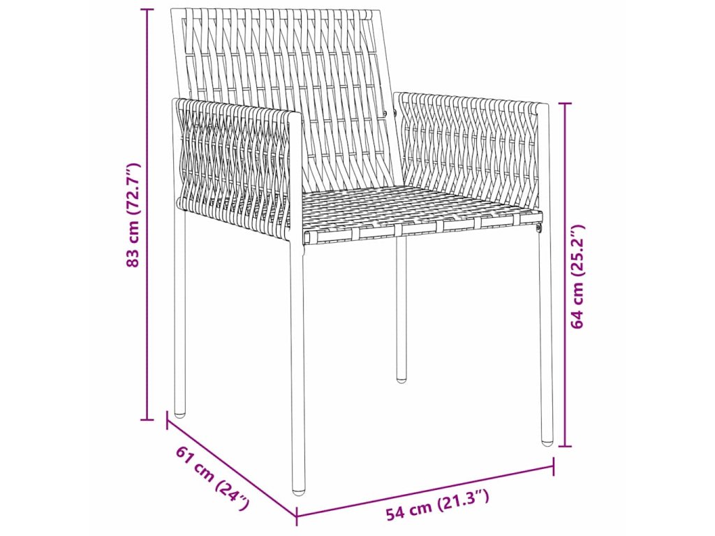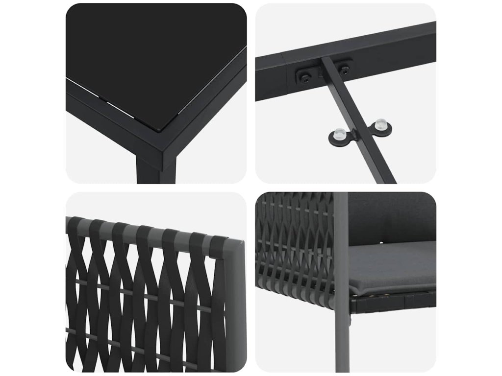 - Odolné materiály: Set kombinuje tkaný poly ratan s práškově lakovanou ocelí, což zajišťuje odolnost a odolnost proti venkovním prvkům. Materiály byly vybírány specificky pro svou odolnost vůči povětrnostním podmínkám, což zaručuje dlouhodobou hodnotu a spolehlivost.