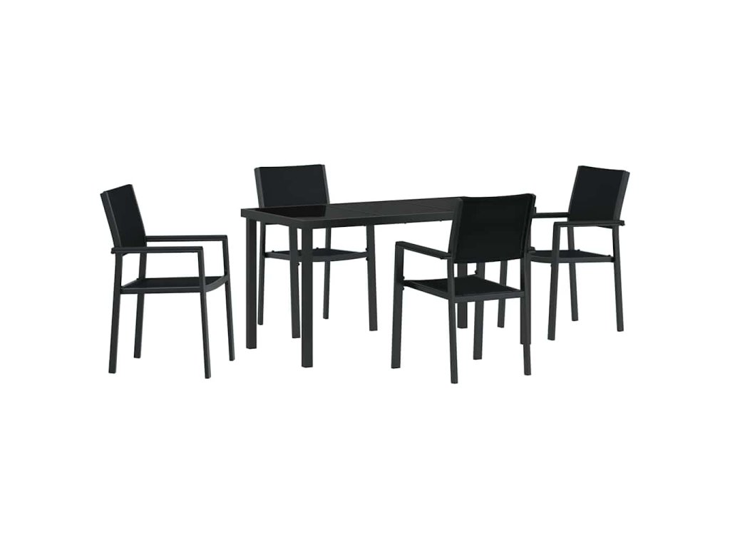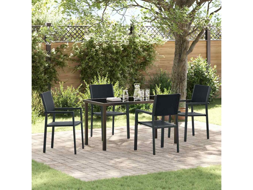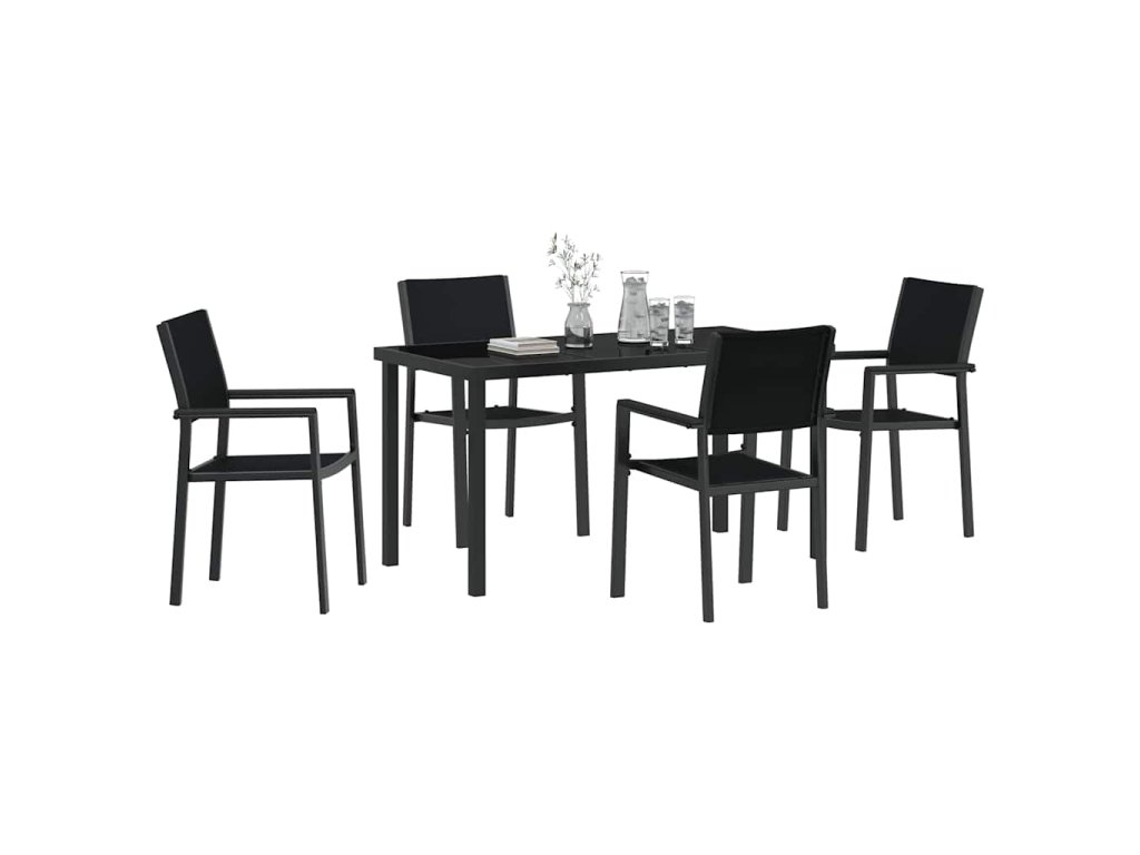 Tato moderní zahradní jídelní souprava je navržena pro ty, kteří si cení jak stylu, tak funkčnosti ve svých venkovních prostorách. S elegantním a moderním vzhledem se tato jídelní souprava bez problémů integruje do jakékoliv moderní zahrady nebo terasy, a nabízí dokonalé místo pro neformální obědy, večeře při západu slunce nebo pohodové kávové přestávky. Bohatý odstín práškově lakovaného černého rámu vytváří elegantní pozadí pro jakoukoli příležitost, poskytující stylovou a přívětivou atmosféru ideální pro letní setkání s přáteli nebo rodinou.