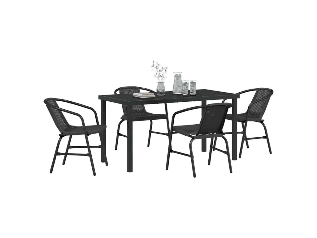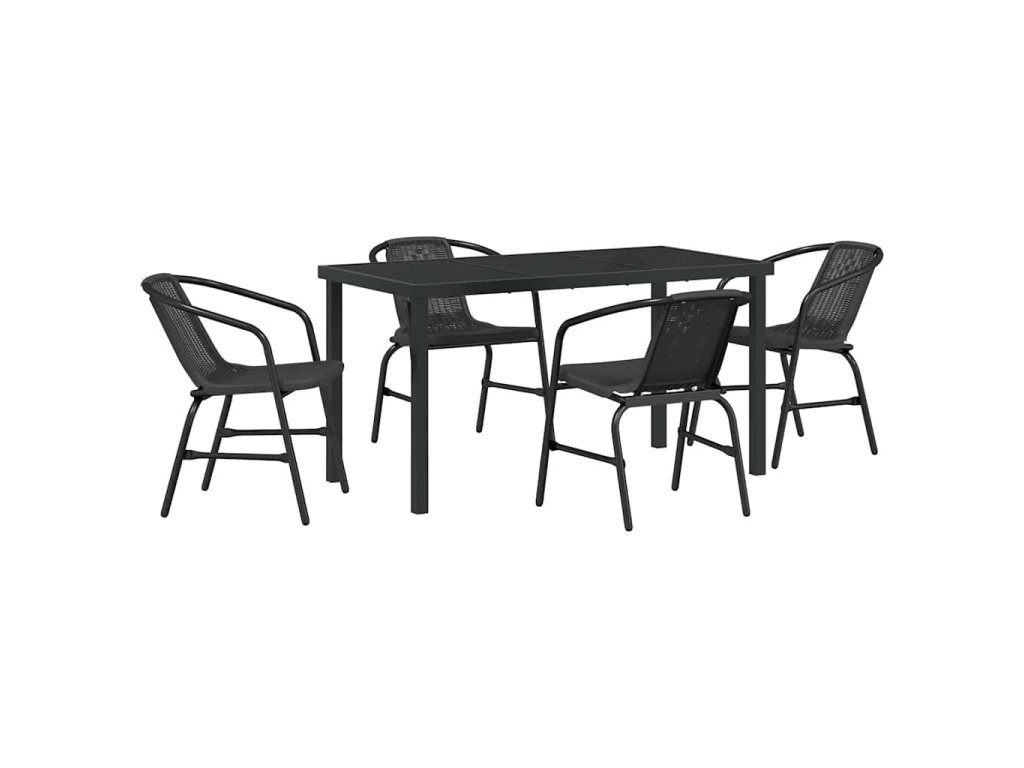 Tento moderní zahradní jídelní set nabízí elegantní a moderní volbu pro váš venkovní prostor. Navržený podle nejnovějších trendů, oslovuje ty, kteří oceňují svěží, stylový vzhled ve své zahradě nebo terase. S chytrým černým povrchem tento set bez námahy vylepšuje jakoukoliv venkovní dekoraci, ztělesňující chic atmosféru, která je ideální pro jakékoliv neformální setkání nebo elegantní večeře. Jeho univerzální design je ideální pro pořádání letních jídel, pohodlný odpočinek s ranní kávou nebo užívání si klidného večera pod hvězdami.