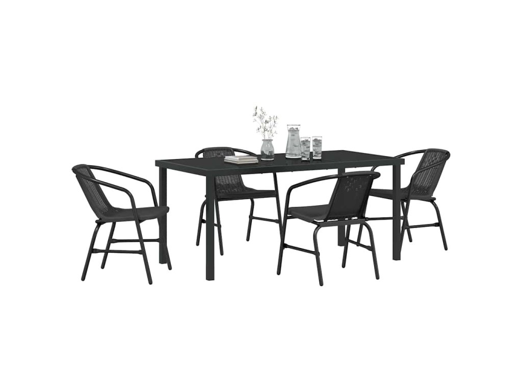 Tento moderní zahradní jídelní set nabízí elegantní a moderní volbu pro váš venkovní prostor. Navržený podle nejnovějších trendů, oslovuje ty, kteří oceňují svěží, stylový vzhled ve své zahradě nebo terase. S chytrým černým povrchem tento set bez námahy vylepšuje jakoukoliv venkovní dekoraci, ztělesňující chic atmosféru, která je ideální pro jakékoliv neformální setkání nebo elegantní večeře. Jeho univerzální design je ideální pro pořádání letních jídel, pohodlný odpočinek s ranní kávou nebo užívání si klidného večera pod hvězdami.