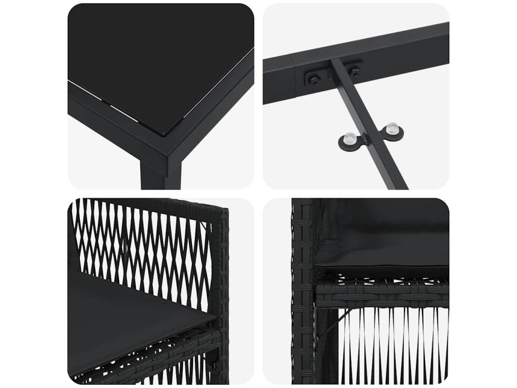 - Součásti: Najdeš obdélníkový stůl s tvrzeným sklem, který se snadno čistí, a pohodlné židle z polyratanu. Každá židle má pěnové polstrované polštáře se zipy, takže je to pohodlné a lehce se o ně stará.