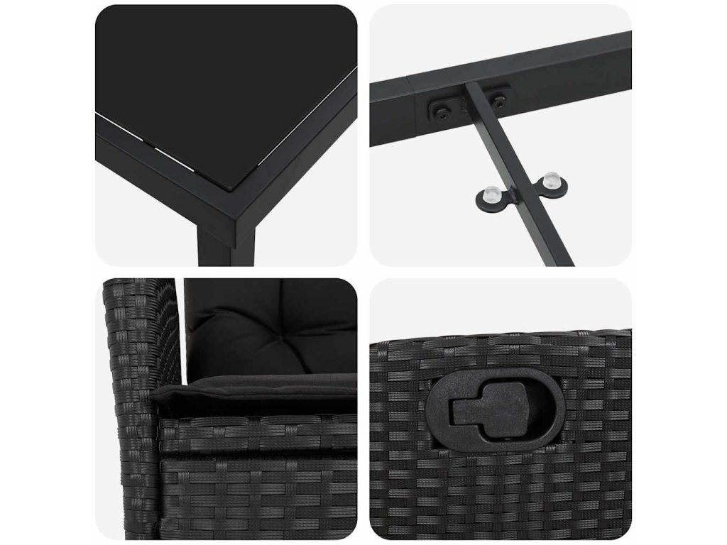 - Materiály: Set je vyroben z kvalitního poly ratanu, oceli a skla. Poly ratan dodává příjemnou texturu a elegantní touch, a skvěle odolává letnímu počasí. Ocelová konstrukce zajišťuje silnou oporu a stabilitu, zatímco skleněná deska je elegantní a lehce se čistí.
