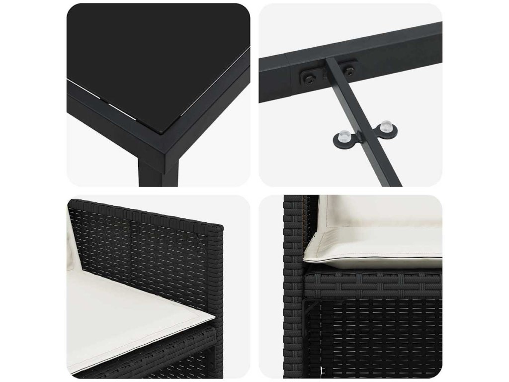 - Moderní materiály: Tento set je udělaný z chytré směsi poly ratanu a skla, což mu dodává originální styl. Poly ratan je známý svou odolností vůči počasí a barvy si dlouho udržuje. Skleněné povrchy přidávají elegantní a moderní vzhled, který skvěle vypadá venku a snadno se čistí.