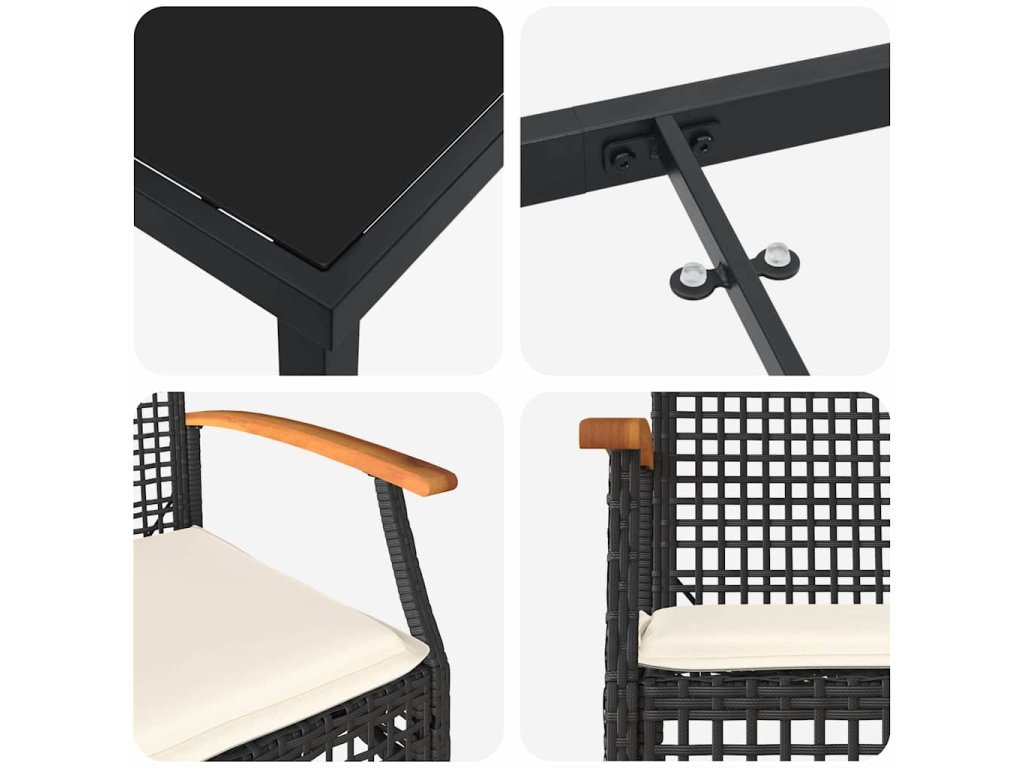 - Praktické funkce: S pevnými ocelovými nohami a rámy, každý kousek v tomto setu slibuje stabilitu a dlouhou životnost. Akáciové opěrky rukou skvěle ladí s pohodlnými poly ratanovými opěradly, takže to má jak hezký vzhled, tak funkčnost pro venkovní stolování.