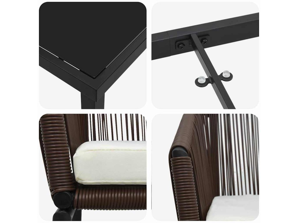 - Odolný rám s práškovým lakováním Rám je navržen s povrchovou úpravou z práškové oceli, která nabízí pevnost a odolnost proti rzi a korozi, zajišťující robustní podpůrnou strukturu jídelní soupravy v průběhu času.