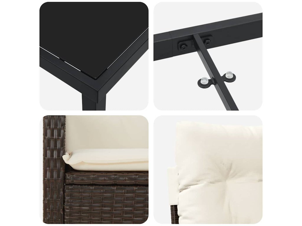 - Materiály: Zahradní jídelní set je vyrobený z elegantní kombinace poly ratanu, oceli a skla. Poly ratan vypadá skvěle a odolává počasí, ocel dodává pevnost a skleněný povrch je elegantní a snadno se čistí. Ta kombinace zajistí, že to vydrží a bude to vypadat dobře dlouho, připravené na všechno od deště po slunečné odpoledne.