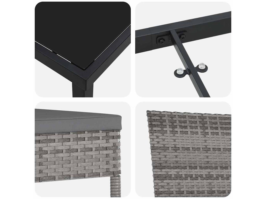 - Materiály: Tato zahradní souprava je vyrobená z polyratanu, který klade důraz na eleganci a funkčnost. Tkaná textura a UV-odolnost jí umožňují zvládnout venkovní podmínky. Práškově lakovaná ocel dodává stabilitu, která odolá každodennímu používání. Společně tvoří odolný produkt, který vypadá skvěle a je super praktický pro venkovní stolování.