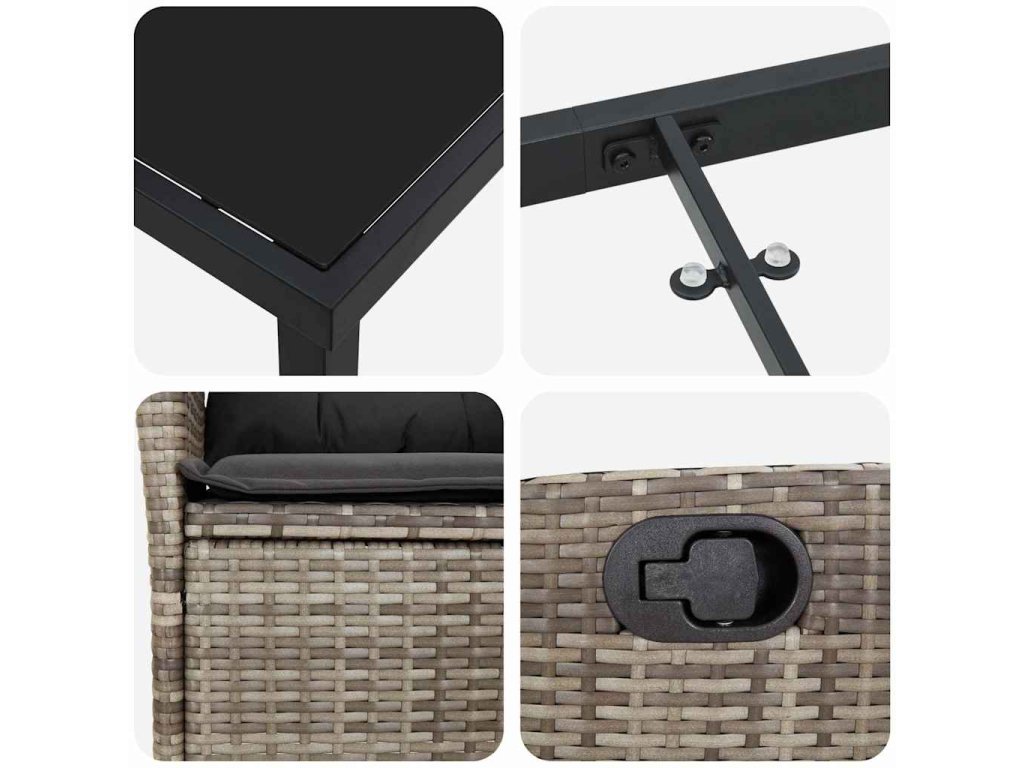 - Materiály: Set je vyroben z kvalitního poly ratanu, oceli a skla. Poly ratan dodává příjemnou texturu a elegantní touch, a skvěle odolává letnímu počasí. Ocelová konstrukce zajišťuje silnou oporu a stabilitu, zatímco skleněná deska je elegantní a lehce se čistí.
