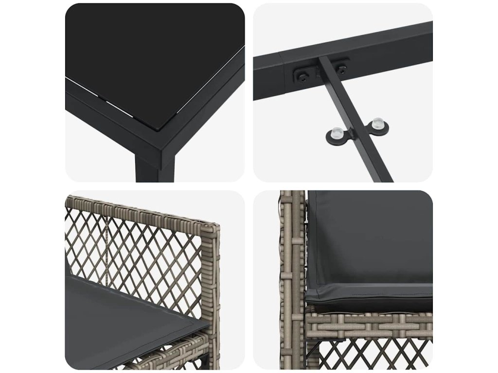 - Materiály: Vyrobený z poly ratanu, tenhle set je nejen hezký, ale taky pohodlný a odolný pro venkovní použití. Silný ocelový rám zajišťuje stabilitu a bezpečnost pro všechny příležitosti.
