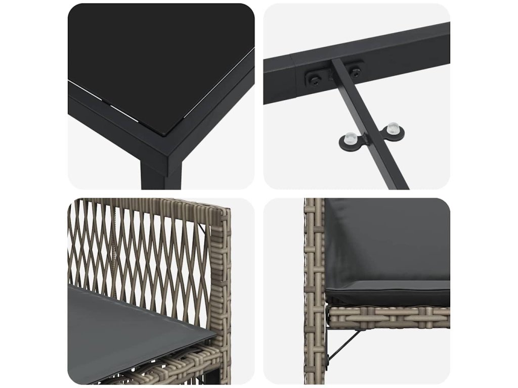 - Materiály: Tato nábytková sada je hlavně vyrobena z poly ratanu, známého svou pevností a odolností vůči počasí, takže ti dlouho vydrží i při častém venkovním používání. Kombinuje štíhlý vzhled poly ratanu s pevným ocelovým rámem, což ti dává perfektní mix stylu a odolnosti. A navíc to skvěle vypadá a je snadné na údržbu – určitě výhra pro venkovní prostory.